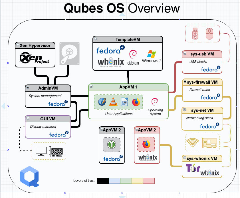 Das System nutzt den Hypervisor Xen, um damit "Qubes" (von "cube", also Würfel) bereitzustellen – voneinander isolierte virtuelle Maschinen (VM), auf denen in der Regel Linux-Distributionen laufen. Es besteht die Möglichkeit, eine ganze Reihe von Qubes zu erstellen, die jeweils voneinander getrennte Bereiche für verschiedene Anwendungen – vom Webbrowser bis zur Desktopumgebung – bereitstellen.